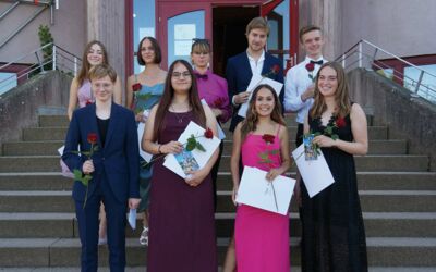 Wenige Tage nach der feierlichen Übergabe der Abiturzeugnisse an acht Absolventen wurden am letzten Schultag vor der ganzen Schulgemeinschaft weitere Schülerinnen und Schüler der 12.Klasse für das Bestehen der Mittlere-Reife-Prüfung und des Hauptschulabschlusses gefeiert.
